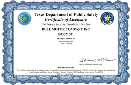 Bull Motor Company is incorporated in the great state of Texas and is fully licensed to operate in all Houston area airports (HLL # 1519). We are commercially insured to protect your most valued assets. We are duly licensed, B03021501, as a Security Contractor & Guard Company regulated by the Texas Department of Public Safety Licensing & Registration Service Private Security Program. If you need to file a complaint, please contact DPS via website or mail: www.dps.texas.gov/rsd/ contact/pspcomplaint.aspx P.O. Box 4087, Austin, Texas 78773
